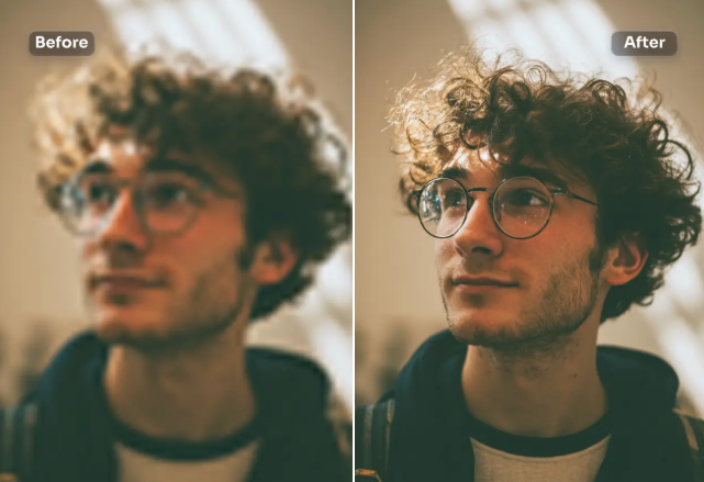 Enhance the existing photo only - keep the original framing, angle, composition, and facial proportions exactly the same. Do not crop, zoom, or convert to a close-up. Improve overall image clarity and sharpness naturally, with special attention to eye detail while keeping the full face and original framing intact. Refine focus slightly for better definition without making it overly sharp.